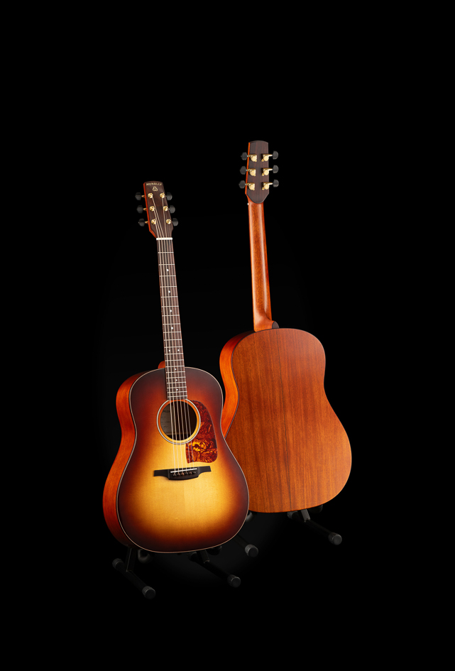 The main difference from an SD versus a traditional dreadnought is the scale length. Here we have a shorter 24.9” which reduces the string tension, giving a warm & woody tone, as well as increased playability. The tone naturally leans more vintage, particularly in its most natural wood combination of Spruce and Mahogany.